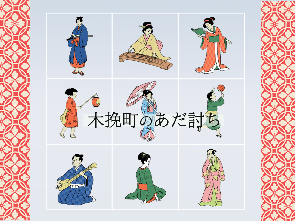 江戸・木挽町の芝居小屋「森田座」で、「仮名手本忠臣蔵」の千秋楽が終わり大勢の観客がわらわらと出てきます。そこに番傘を持つ赤い振袖を着た女性が通りがかり、町のゴロつきが声をかけます。いかにも悪人の顔をしています。